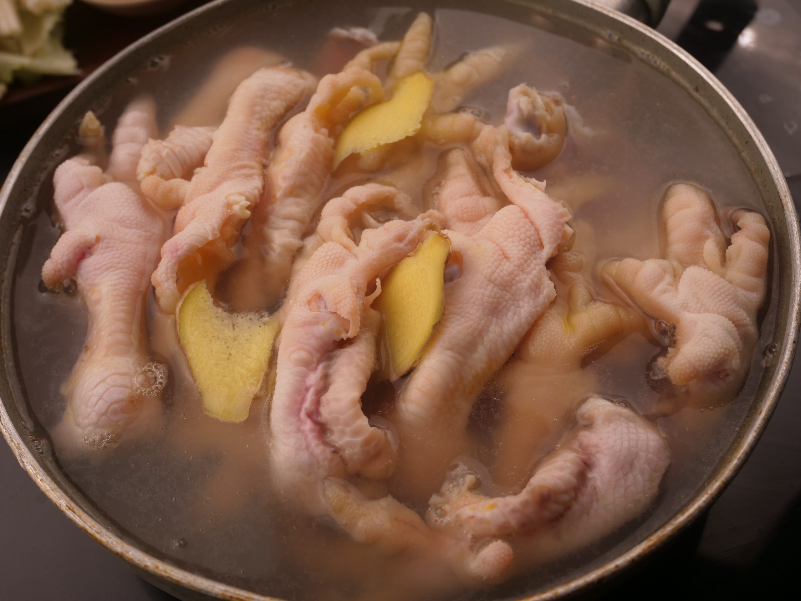 1. Đầu tiên, cho chân gà trần qua với rượu mirin và gừng, sau đó vớt ra ngâm ngay vào bát nước đá.